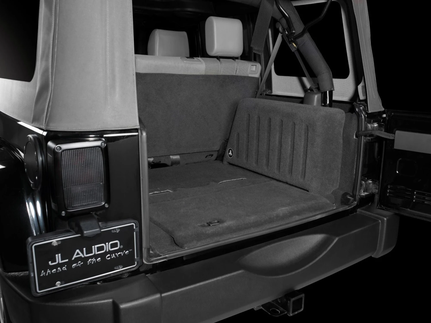 The Hard Data: Contains one 13TW5v2-2 subwoofer in a sealed enclosure. 600 watt power handling. Wired for 2 ohm mono. Installs against passenger-side wheel well. Requires removal of factory “subwoofer”, if so equipped. For model years 2011-Up with a 12V accessory plug on the rear passenger side cargo panel/subwoofer, you must purchase a plain (without subwoofer) passenger side rear cargo trim panel (part #1pu12dx9ag) and a cover for the upper seat belt / roll bar (part #1pu18dx9ad) from Jeep/Mopar parts. Use of the accessory outlet is lost with Stealthbox® installation.