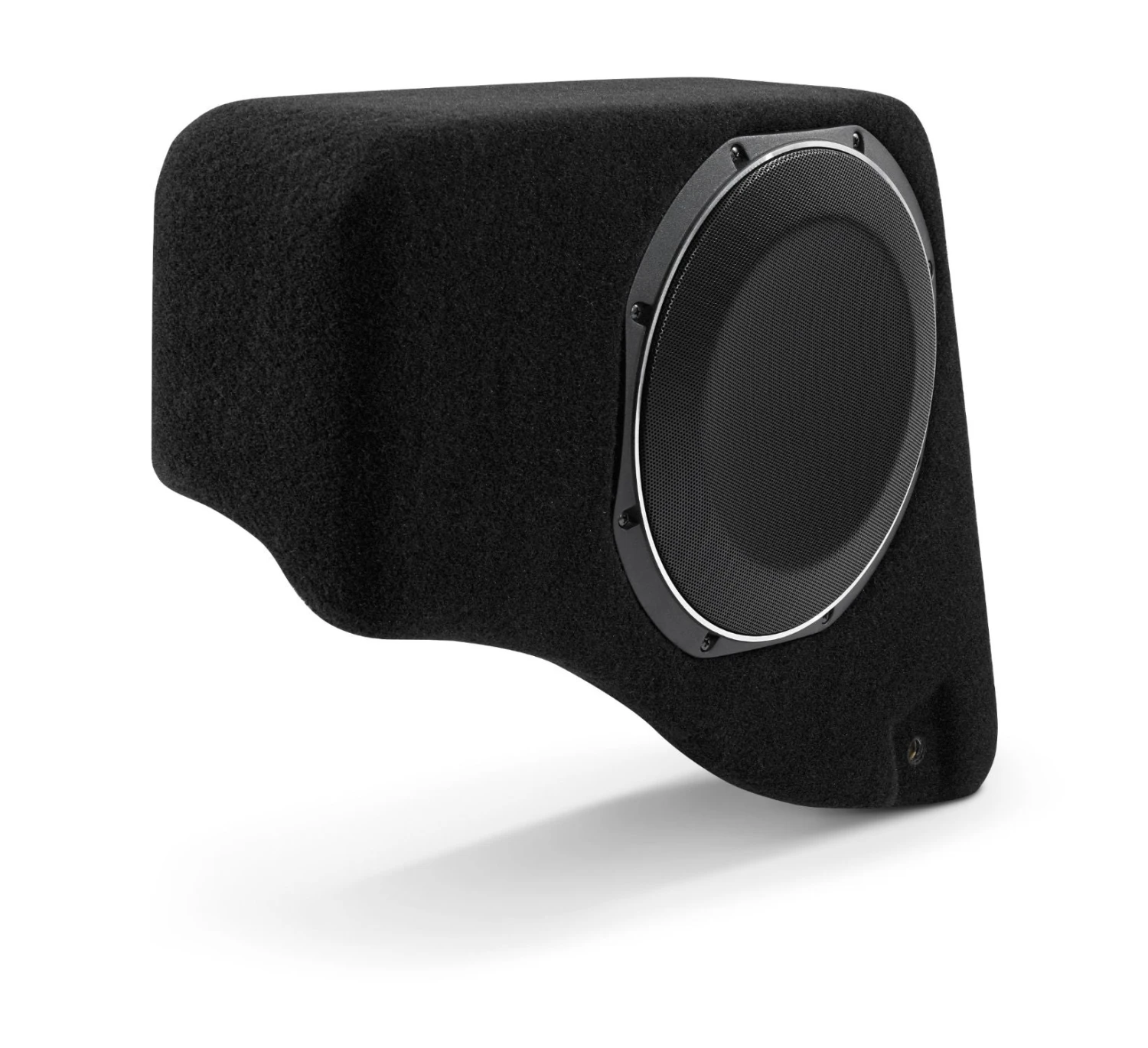 The Hard Data: Each system contains one 10TW1-2 in a sealed enclosure with 300 watt power handling. Each enclosure is wired for 2 ohms. A steel mesh grille is included with each to protect the Subwoofer. Each enclosure installs above one rear wheel well, with specific models for passenger and driver side. Does not affect hard top installation.