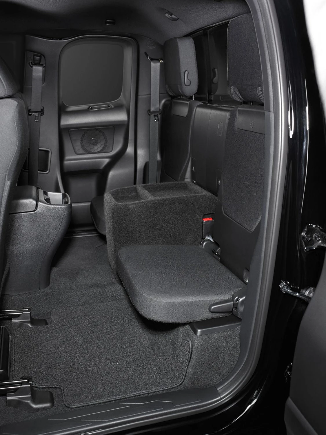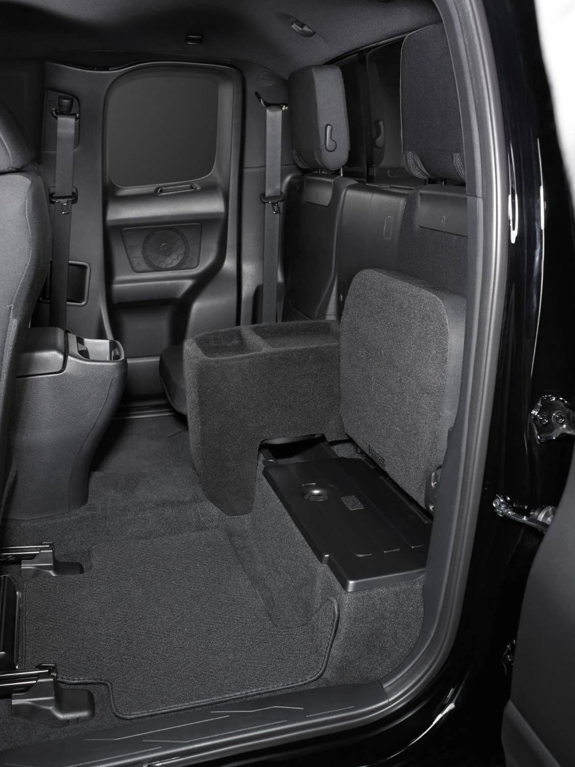 The Access Cab version of Toyota’s midsize truck has minimal backseat space for passengers and almost no room for a bulky subwoofer enclosure.